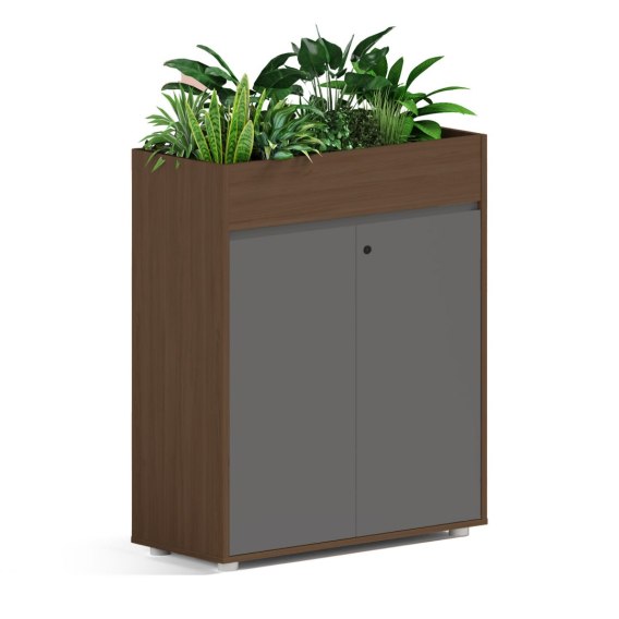 Wielofunkcyjny mebel do open space: górne koryto na doniczki i pojemna szafka poniżej. Zapewnia prywatność między stanowiskami i wprowadza naturalną zieleń, podnosząc komfort pracy i estetykę biura.