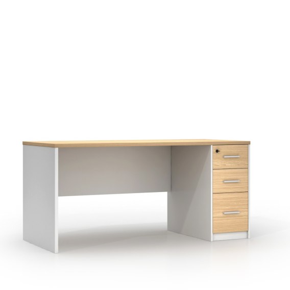 Trzy pojemne szuflady pomagają uporządkować dokumenty i akcesoria. Biurko świetnie komponuje się z jasnymi fotelami ergonomicznymi Angel, wprowadzając ład i lekkość do przestrzeni roboczej.