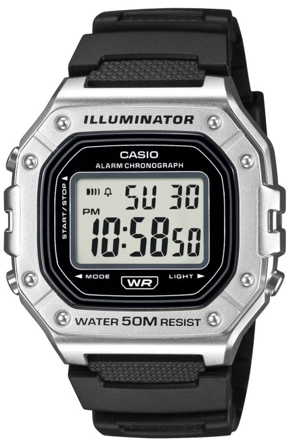 Czytelny wyświetlacz LCD zapewnia łatwy odczyt godziny w formacie 12- lub 24-godzinnym, a jego układ jest intuicyjny i funkcjonalny. Górna część ekranu wyświetla informacje o dniu tygodnia, alarmie oraz funkcjach dodatkowych, natomiast dolna wskazuje aktualny czas. Zegarek jest wyposażony w podświetlenie LED, które pozwala na odczyt godziny w warunkach słabego oświetlenia.