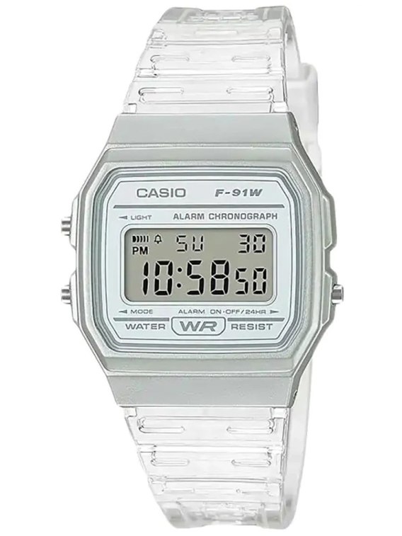 Zegarek Unisex Casio Retro Vintage F-91WS-7 to ikona stylu, która od dziesięcioleci podbija serca miłośników mody i funkcjonalności. Ten kultowy model to prawdziwy powrót do korzeni - minimalistyczny, lekki i niezwykle praktyczny, ale jednocześnie pełen charakteru i nostalgicznego uroku. Jego prostokątna, biała, przezroczysta koperta z jasnym wyświetlaczem i pasek w tym samym kolorze to klasyka, która nigdy nie wychodzi z mody. Cyfrowy wyświetlacz z wyraźnymi, czarnymi cyframi i prostym interfejsem sprawia, że czas odczytasz jednym spojrzeniem, a dodatkowe funkcje, takie jak stoper, alarm i kalendarz, czynią go niezastąpionym towarzyszem na co dzień.