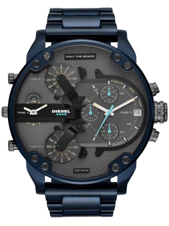 Zegarek męski Diesel Mr. Daddy 2.0 DZ7414 to duży męski zegarek. Granatowa bransoleta doskonale komponuje się z kopertą w tym samym kolorze, które wykonano z hipoalergicznej stali szlachetnej. Na tarczy zamontowano 4 oddzielne mechanizmy mierzenia czasu. Całość pokryta szkłem mineralnym gwarantuje wytrzymałość na zarysowania i pęknięcia. Wodoodporność na 30 metrów chroni przed zachlapaniem. Zastosowany mechanizm kwarcowy jest niezawodny. Model Diesel Mr. Daddy 2.0 DZ7414 to połączenie niewymuszonej elegancji ze sportowym charakterem - musi przyciągać uwagę!