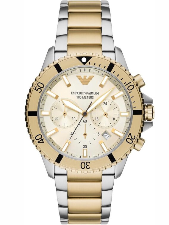 Męski zegarek Emporio Armani AR11606 Two-Tone Chronograph to stylowy męski zegarek, idealny zarówno do eleganckiego ubioru, jak i do noszenia na co dzień. Bransoletka oraz koperta wykonane zostały ze stali szlachetnej. Na złotej tarczy zabezpieczonej mineralnym szkłem znajdziemy datownik wskazujący dzień miesiąca oraz wskazania chronografu i czasu dobowego. Zegarek Emporio Armani AR11606 Two-Tone Chronograph trafi w gust każdego mężczyzny i będzie idealnym prezentem na każdą okazję. Klasa wodoszczelności czasomierza to WR100, co gwarantuje szczelność zegarka np. podczas pływania.