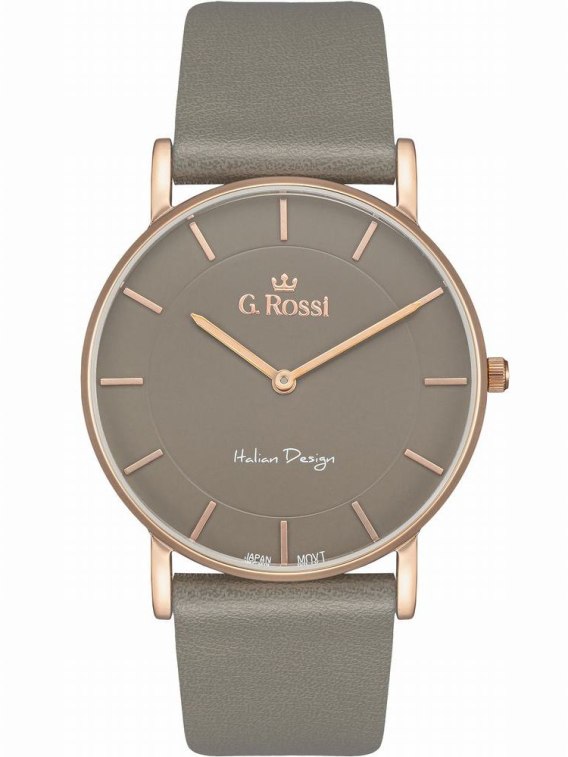 Zegarek damski G. ROSSI G.R737A-1B3-2 to elegancka propozycja na co dzień, która łączy subtelną kobiecość z wyjątkowym stylem. Z szarym paskiem ze skóry, kopertą w odcieniu różowego złota i szarą tarczą, prezentuje się bardzo szykownie. Indeksy na tarczy w kolorze złota, które dodają mu blasku i finezji. Zegarek posiada wodoodporność na poziomie WR30, co zapewnia komfort użytkowania w codziennych sytuacjach. Idealny wybór dla kobiet ceniących elegancję, ale szukających także praktyczności w swoich dodatkach.