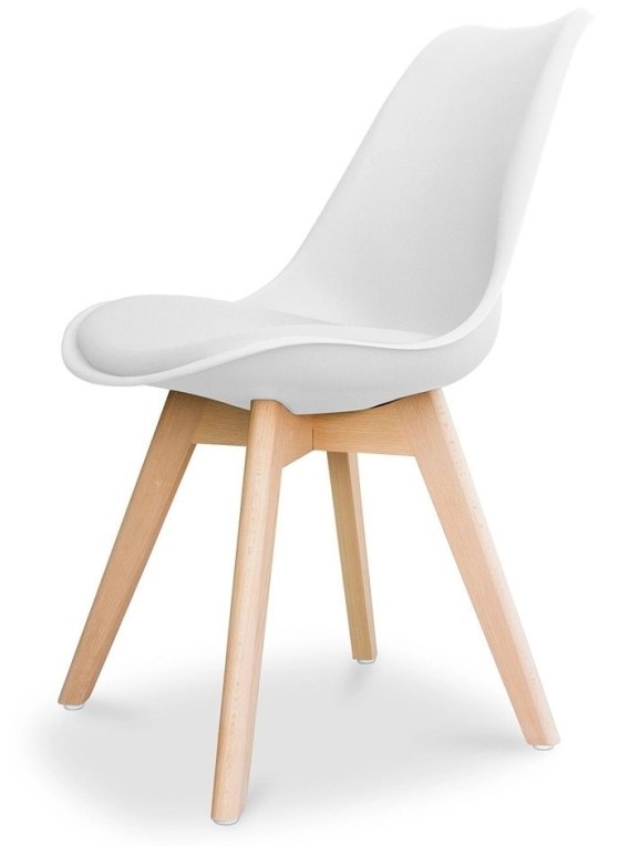 Nowoczesne krzesło w stylu skandynawskim w kolorze białym, z miękką poduszką siedziska do jadalni, salonu, kuchni.