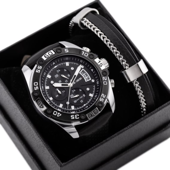 Komplet prezentowy męski, który łączy elegancję z ponadczasowym stylem. Zawiera zegarek marki Paul Lorens, na czarnym pasku, z klasyczną, czarną tarczą ozdobioną srebrnym indeksem, co nadaje mu subtelną i wyrafinowaną estetykę. Srebrna koperta zegarka doskonale komponuje się z całością, tworząc wyjątkowy design. Zegarek charakteryzuje się wodoszczelnością WR30, co zapewnia jego funkcjonalność i trwałość. Komplet zawiera również skórzaną, czarna bransoletę ze srebrnymi elementami, która stanowi doskonałe uzupełnienie całości. To idealny wybór na święta - elegancki, męski i wyjątkowy prezent, który zachwyci każdego.