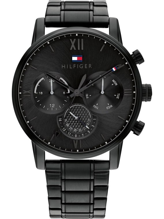 Zegarek męski Tommy Hilfiger SULLIVAN 1791879 to stylowy męski zegarek, idealny zarówno do eleganckiego ubioru, jak i do noszenia na co dzień. Bransoletka oraz koperta wykonane zostały ze stali szlachetnej w kolorze czarnym. Na tarczy zabezpieczonej mineralnym szkłem znajdziemy datownik wskazujący dzień miesiąca oraz subtarcze będące wskazaniami dni tygodnia, aktualnej daty oraz 24h czasu dobowego. Klasa wodoszczelności czasomierza TOMMY HILFIGER SULLIVAN 1791879 to WR50, co gwarantuje szczelność zegarka w przypadku drobnych zachlapań.
